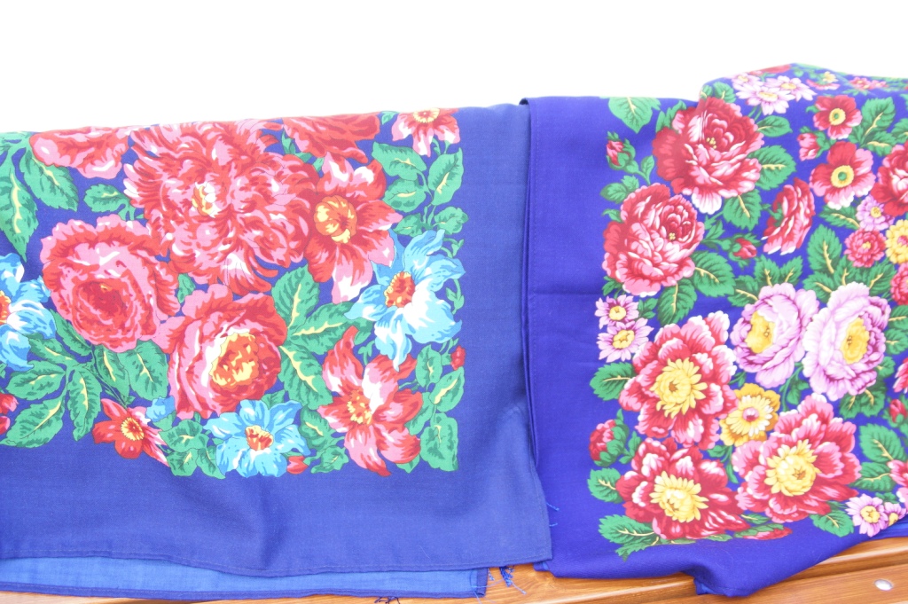 Розы и пионы-13, Переполох-13.На фото не видно, но грунт платков отличается Розы и пионы более сине-голубые, а Переполох сине-фиолетовый.