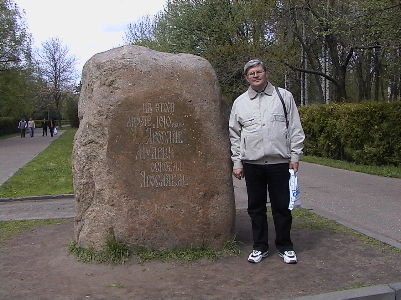 В парке на набережной установлен камень в честь основания города. Забавно. что на нем, возможно, нет ни слова правды. Город основан не в этом году, возможно, не Ярославом Мудрым, а другим Ярославом, и точно не на этом месте, т.к. древнее поселение лежит за рекой Которосль, куда мы ходили, и где стоят прекрасные краснокирпичные церкви с изумительными изразцами.