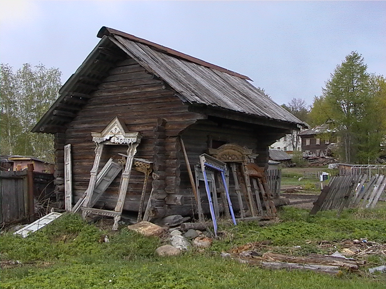 до избы бобыля, украшенной розетками в виде ракушек, как на Архангельском соборе в Кремле, что говорит о несомненном влиянии итальянского искусства на провинциальную русскую глубинку. Кроме того, здесь огромное собрание резных оконных наличников, некоторые развешаны на стенах изб, другие же пока свалены в кучу, также и многочисленные кованные решетки и кресты.