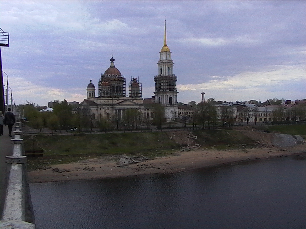Со всеми заморочками в Рыбинск прибыли в 11.45. К этому времени слегка успела испортиться погода, безоблачное небо затянулось тучами. Рыбинск встретил нас огромным количеством знаков «Туда ехать нельзя», «Останавливаться запрещено», но мы все же нашли местечко для Матиза, и, оказалось, рядом с главной улицей. Теперь она называется Крестовая, а раньше была проспект Ленина. Вообще все в центре или ремонтируется, например, с Крестовой снят асфальт, а многие дома обшарпанные и разваленные, или только что покрашенные, где уже мелкие капиталистики завели свои лавочки. Застройка двухэтажная, редко трехэтажная. Гигантский Спасо-Преображенский собор тоже весь в лесах и развале, но вроде его чинят.