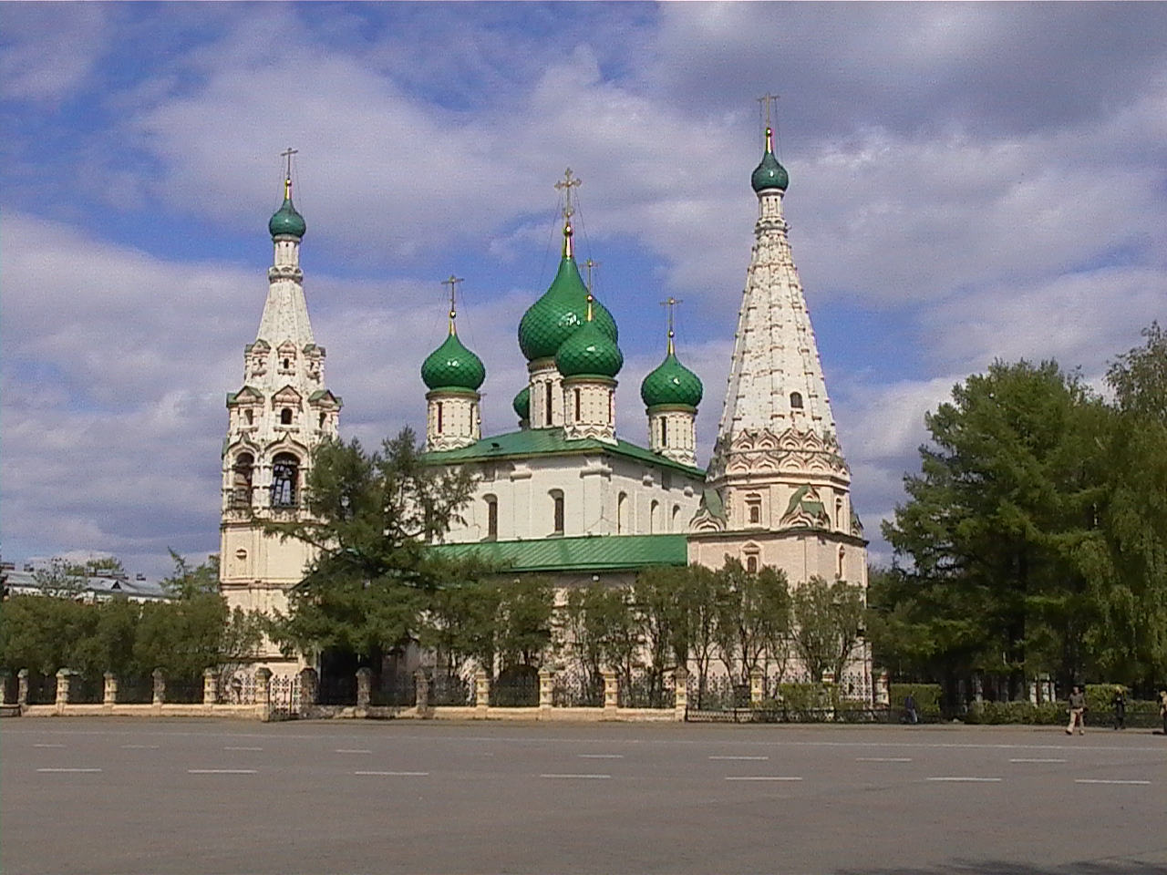 Нам повезло, мы везде были совершенно одни, толпы экскурсантов набегали потом. Прогулялись по малолюдным, обихоженным набережным до частного музея, где купили знаменитые ярославские колокольчики, вышли на площадь с церковью Ильи Пророка, потом к театру им. Федора Волкова и принялись искать «Блинную», в которую я заходила каждый раз во время проезда через Ярославль во время учебных экскурсий в 1986 году, исходили все расходящиеся от театра улицы-лучи, но не нашли ничего подобного, видно я все перезабыла или местность изменилась. Тогда заглянули в другое кафе, где тоже вкусно поели (220 руб. на двоих). Времени у нас было еще много, Матиз пребывал на охраняемой стоянке, Вова за него не волновался, и мы пошли через мост на ту сторону Которосли, чтобы попасть к ее устью, где стоят две красивые церкви 17 века, надо было их рассмотреть поподробнее. Шли мы долго-долго, видели и какие-то полуразрушенные лачуги и рядом возводящиеся настоящие дворцы, но в конце концов оказались возле церквей. Обе они красного кирпича и украшены совершенно потрясающими изразцами, даже, на мой взгляд, лучше, чем знаменитая Успенская церковь на площади перед Спасским монастырем. Просто целые панно сделаны из изразцов. Кстати, берег Волги тут не обустроен, имеет обычный дико-пляжный вид. Вова сидел, смотрел на реку, а я со всех сторон обходила церкви (кстати, оказавшиеся действующими и старообрядческими), ища наилучшую точку для фотосъемки. Это было не так-то легко, т.к. то провода мешают, то забор, то солнце не с той стороны, то оно зайдет за тучку, но я все-таки сделала пару приемлемых кадров. Потом мы вернулись, уже другим путем, через Закоторосльский район (и не выговоришь). В половине шестого поехали в обратный путь.