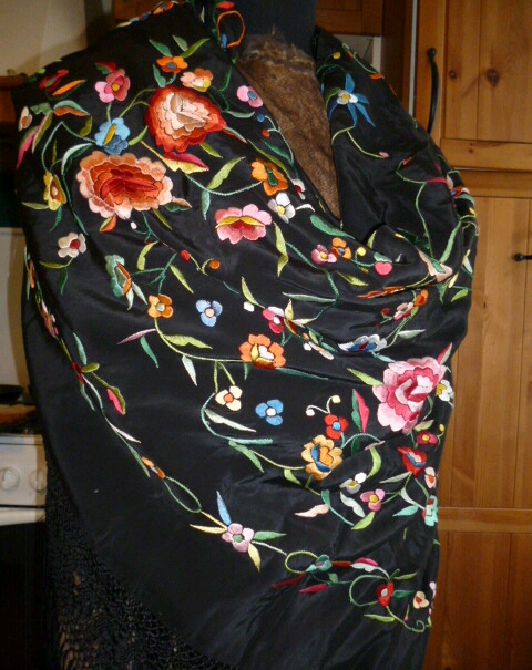 Хочу сегодня похвастаться своим недавним приобретением, приехавшим из Калифорнии. Купленная на Ebay вышитая шаль из натурального шелка, которая была представлена как китайская 20-30х годов (?). Состояние ОЧЕНЬ хорошее, что дает мне повод думать, а не испанский ли это мантон...Любуюсь: