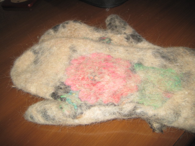 Сваляла такие смешные и невесомые варежки из собачей шерсти,с фрагменом старого платка