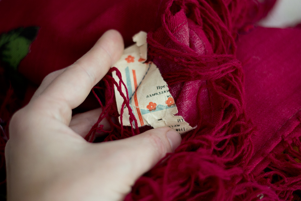 Платок из местной комиссионки. На остатках бирки можно разглядеть слово "Туркменистан" и сама она на туркменском языке. Напрашивается вывод о том, что он сделан там, но мне он очень уж напоминает ППМ. Или ошибаюсь, и он даже не похож?