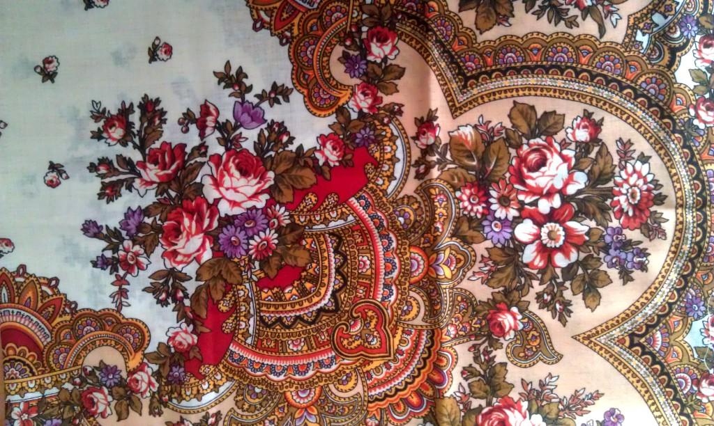 Это точно не 184 платок, у меня такой был, с синими медальонами. По колориту, первое впечатление, что это Качели Слащевой, но достала шаль, и не могу найти такого кусочка ><