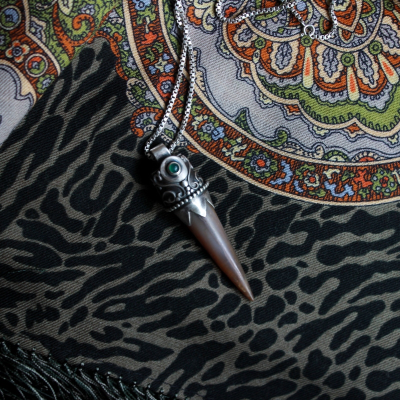 Это кулон с белемнитом, который я отдавала оправить знакомой, занимающейся серебряной глиной. Попросила ее, чтобы смотрелось как старинное оружие (люблю красивые ножи, ножны и всякое такое ;) )