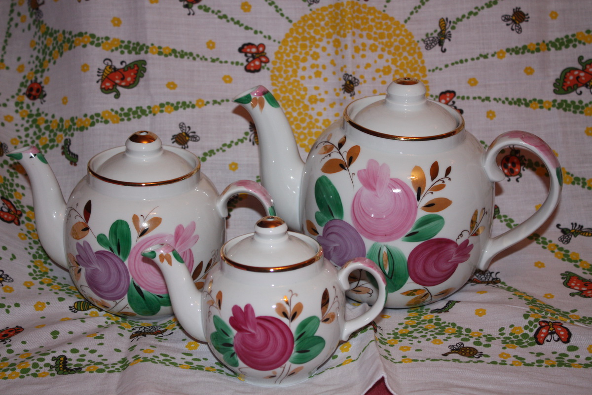 Не смогли удержаться от покупки комплекта дулевских чайников с агашками, ну очень симпатичных и недорогих.