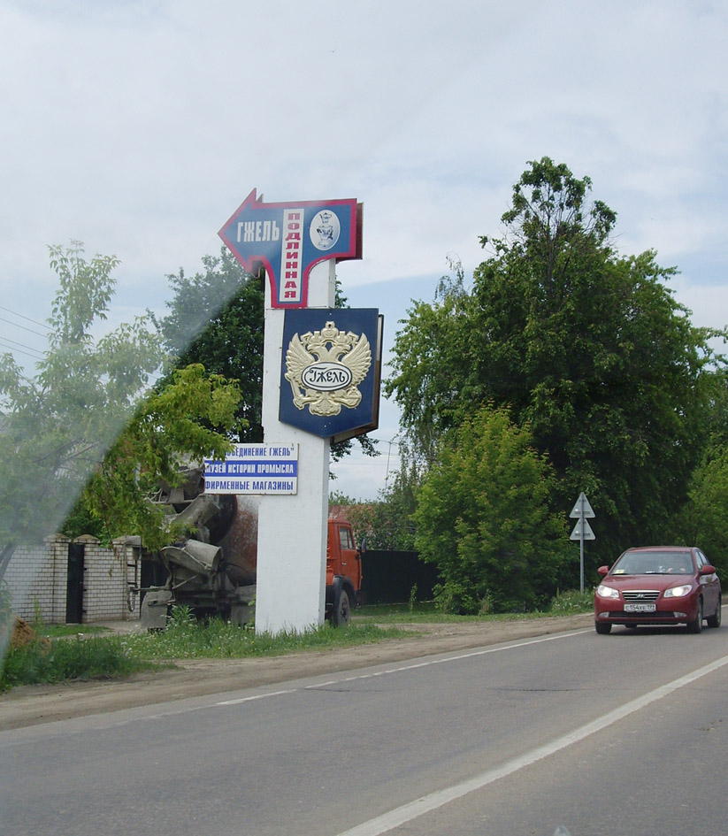 Ехали от Москвы по Егорьевскому шоссе, минуя Гжель и Речицы до поворота на Ново-Харитоново. Начиная от Обухово, по обеим сторонам шоссе часто попадаются магазины гжельского фарфора, все как один - фирменные. Киоски и просто выносные столики - тоже. Мы не брали под сомнение подлинность продукции, но поехали на экскурсию к правообладателю товарного знака. По правой стороне шоссе два ориентира - часовня, выложенная характерной бело-синей плиткой и за ней указатель “Подлинная Гжель”, ЗАО Объединение Гжель.