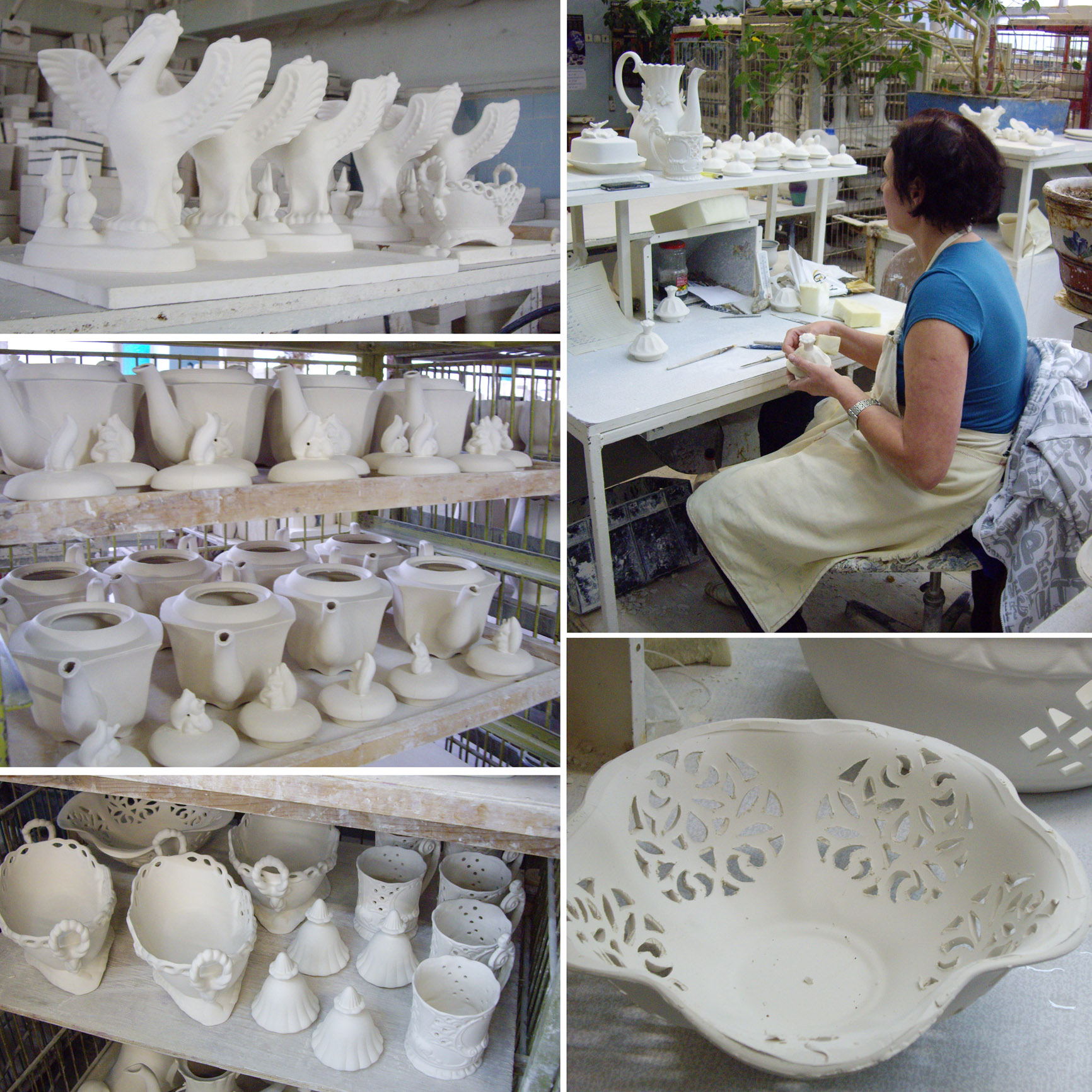 Отливка изделий. Гипсовые формы используются тридцать раз, не больше. Все изделия отливаются и обрабатываются вручную. Самые сложные вещи могут иметь до пятидесяти отдельно отлитых деталей. Автоматизированная линия есть только для цилиндрических кружек и самых простых по форме блюдец. С вынутого из формы изделия мастер убирает следы швов влажной губкой и фарфоровым раствором прикрепляет ручки-носики и прочие детали, затирает неровности.