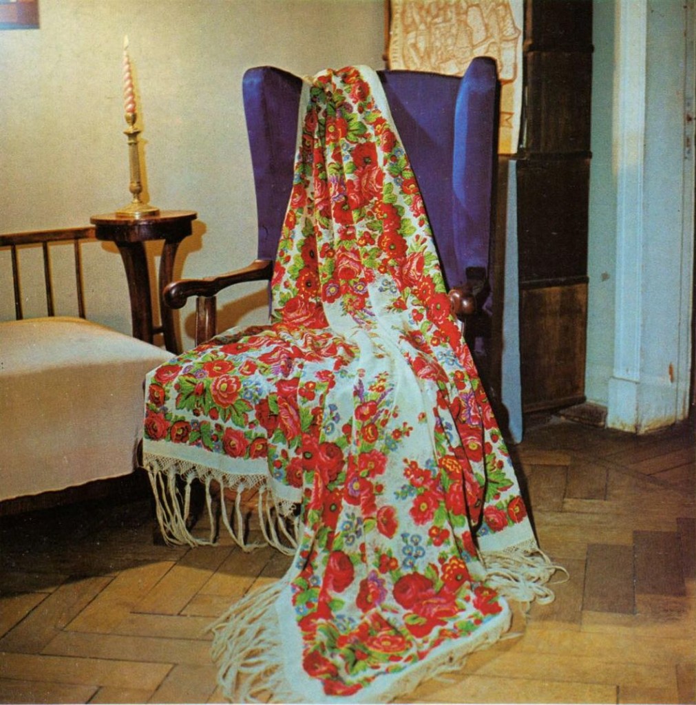 И последний, из той же книги: Старинные набивные шерстяные павловские платки. Горьковский историко-архитектурный музей-заповедник. Синий невероятно красив.