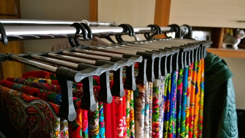 вешалка эта может и сгибаться, что существенно уменьшает задействованное платками пространство. можно для каждой вешалки купить специальный чехол (в котором хранят одежду) с прозрачным передом (чтобы было видно платки), и надевать такой чехол как защиту от пыли.