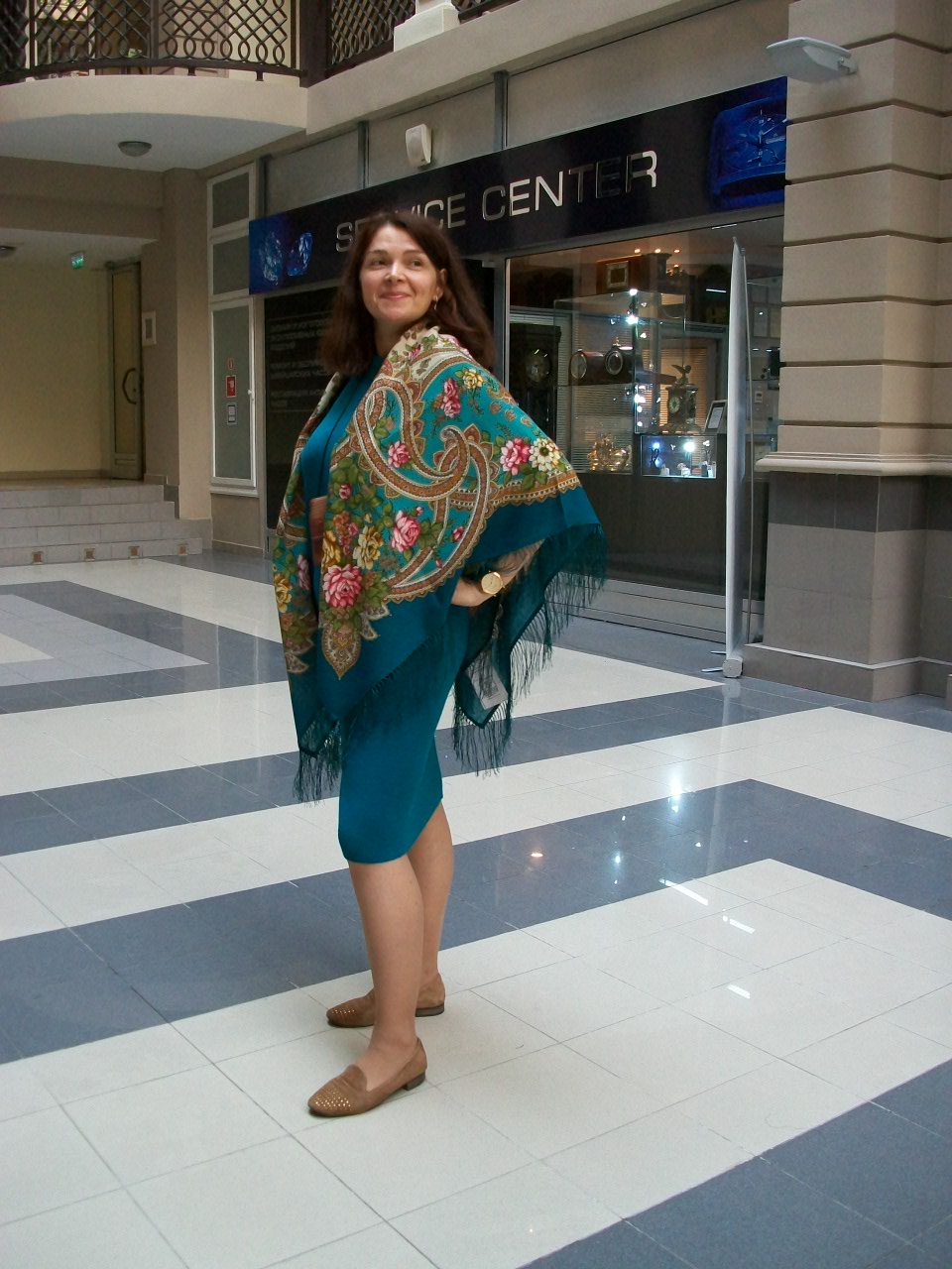 Ева, жаль что мало показываетесь, очень красивое сочетание платья и платка!