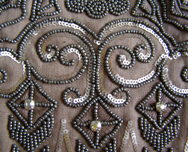 В вышивке использованы шёлковые нитки "перле" и крошечные пайетки (куплены в Париже), бисер "под старое золото" (наш) и стразы "Сваровски". Подкладка - ситчик с "Трёхгорки". Оригинал тоже где-то у Васильева подсмотренный (не могу вспомнить где).