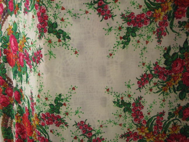 Еленика, эта шаль есть в книге Толстухиной, Полосиновой. Вот, что именно там написано о ней: К.Е.Аболихин (?) Шаль. 1958 г. по рисунку 1930-х гг.(?) Шерстяная ткань, ручная набойка, шелковая бахрома. 157х157 см