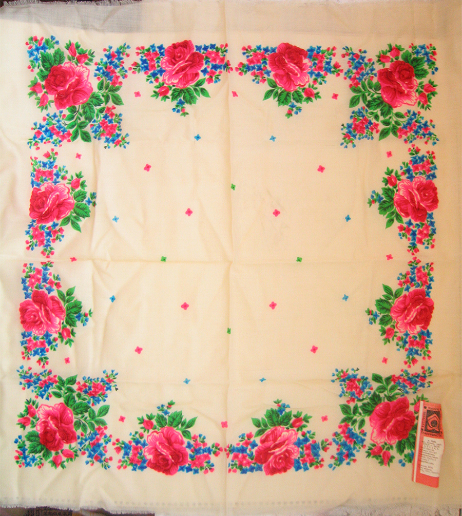 Все при нем: родамин, чистый синий и изумрудный цвета, отсутствие контура. У этого и всех остальных платков цвет фона теплый кремовый, экрю, чисто белые встречаются редко. Не знаю, такими ли они продавались, или потемнели от времени. Могу только сказать, что ношены эти платки не были.