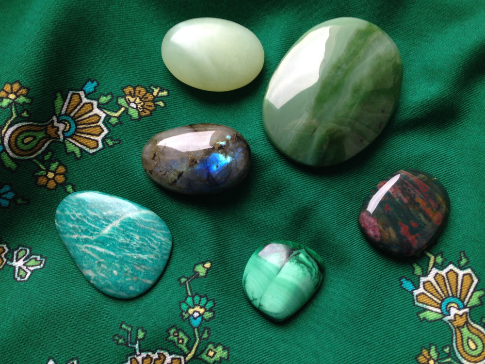 Слева вверх и по кругу - амазонит, лабрадорит, светло - зелёный жадеит,