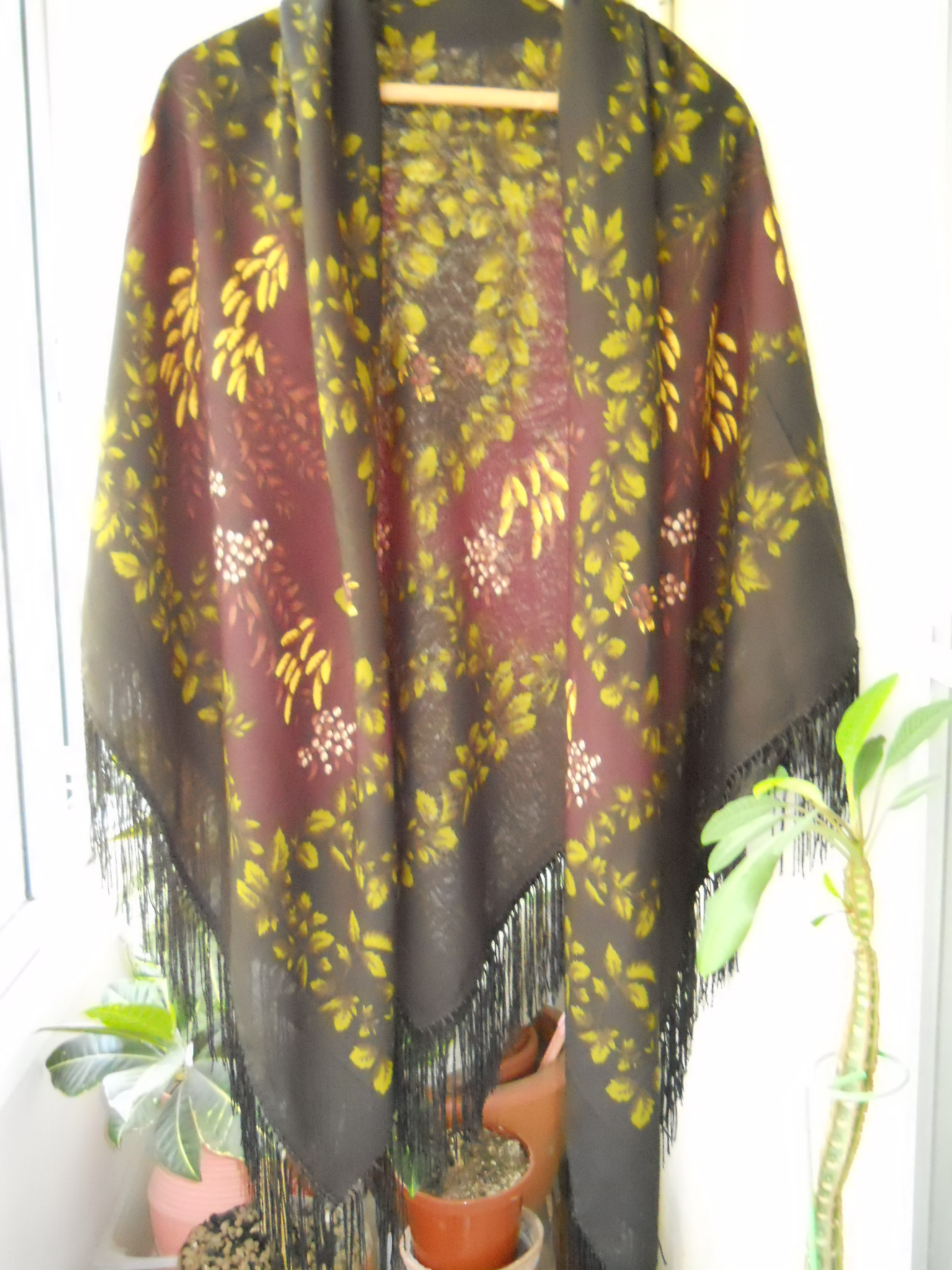 Повесила на бельевую веревку, посмотрела на сколько хочу укоротить, отрезала кажется пятую часть. Сделала бумажный столбик и , как парикмахер, стригла, прикладывая "лекало". Рука не дрогнула. Если посмотреть внимательно -на шали бахрома не очень ровная и неидеальности не будут заметны(если таковые случаться). Тем более в движении или в драпировке. Но много не отрезайте.
