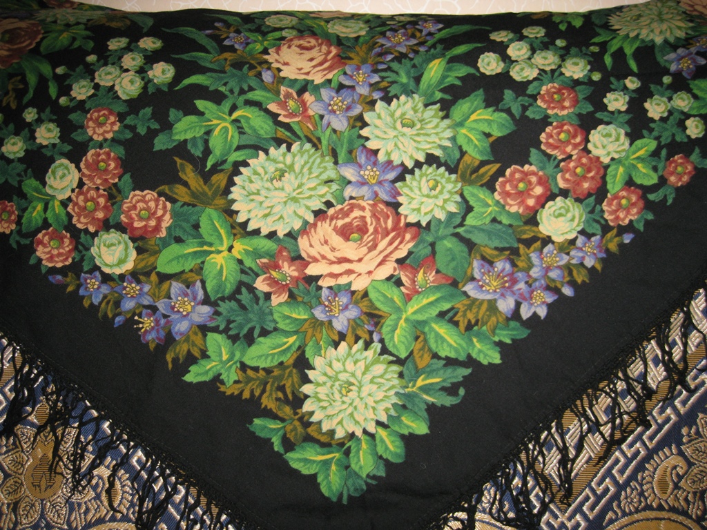 Здравствуйте! Есть у меня шаль, еще мама в молодости носила. Не из павловопосадских ли она? Ткань довольно плотная, шерсть, размер полотна примерно 145х145, по низу украшена шерстяной бахромой с плетением. Платочек старенький, пережил не одну стирку, и почему-то мне кажется , что розы изначально были ярче, зелень сочная, но точно не знаю, не видела каким он был "до". На фото розы кажутся красноватыми, на самом деле они бордово-коричневые и лепестки георгин в серединке слегка розовые и это мне кажется старит платочек. Хотя сам узор очень мне нравится ! Пока не решилась выйти в нем в люди, хотя примеряла