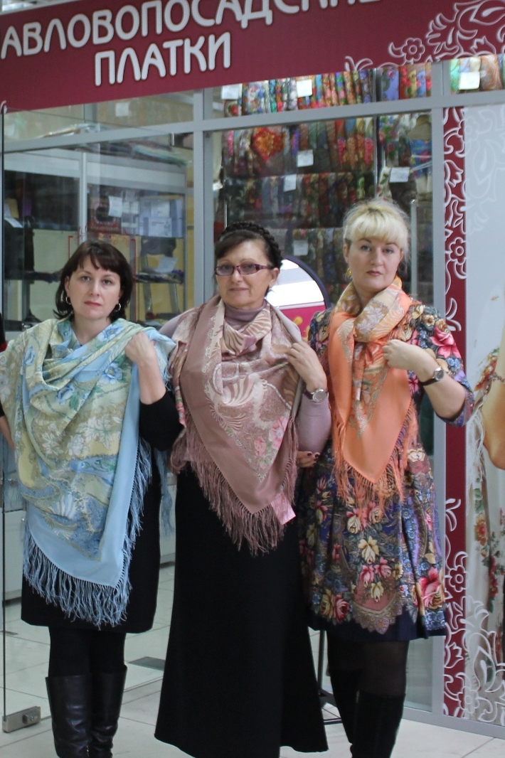 Татьяна привезла несколько платочков из своей коллекции- Черные глаза синий, Фламенко и синий с просновками, Утренняя свежесть(?) , по-моему. Мне очень понравился.
