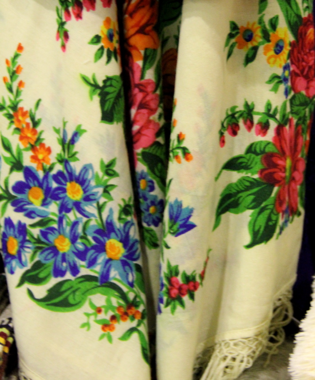 Кроме павильона с ППП, я увидела два больших старинных платка (белый и чёрный). Стенд справа от сцены. Цену не узнавала.