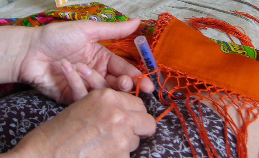 Прелесть работы на коленках в том, что не нужно специально оборудовать место и можно творить как перед телевизором, так и на лавочке во дворе, и даже в машине, в автомобильной пробке (особенно, если не за рулем)… Метод подойдет тем, у кого необходимость сделать ячеистую бахрому возникает редко. Минус метода – могут затекать спина и шея.
