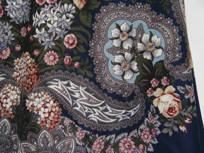 Над серебряной водой 734-15, Татьяна Сухаревская. Эта шаль запала мне в душу сразу, как только я ее увидала, НО у меня уже была вишневая. Я долго внутренне сопротивлялась, и она победила. Я в восторге! Мне она нравится пожалуй даже больше вишневой. Это сочетание цветов великолепно! Фон очень темно-синий, немного в серый (чуть-чуть). Зелень темно-зеленая, почти не выделяется на фоне, но ярко светятся цветы. В рисунке розовый, голубой, серо-голубой и оттенки серого.