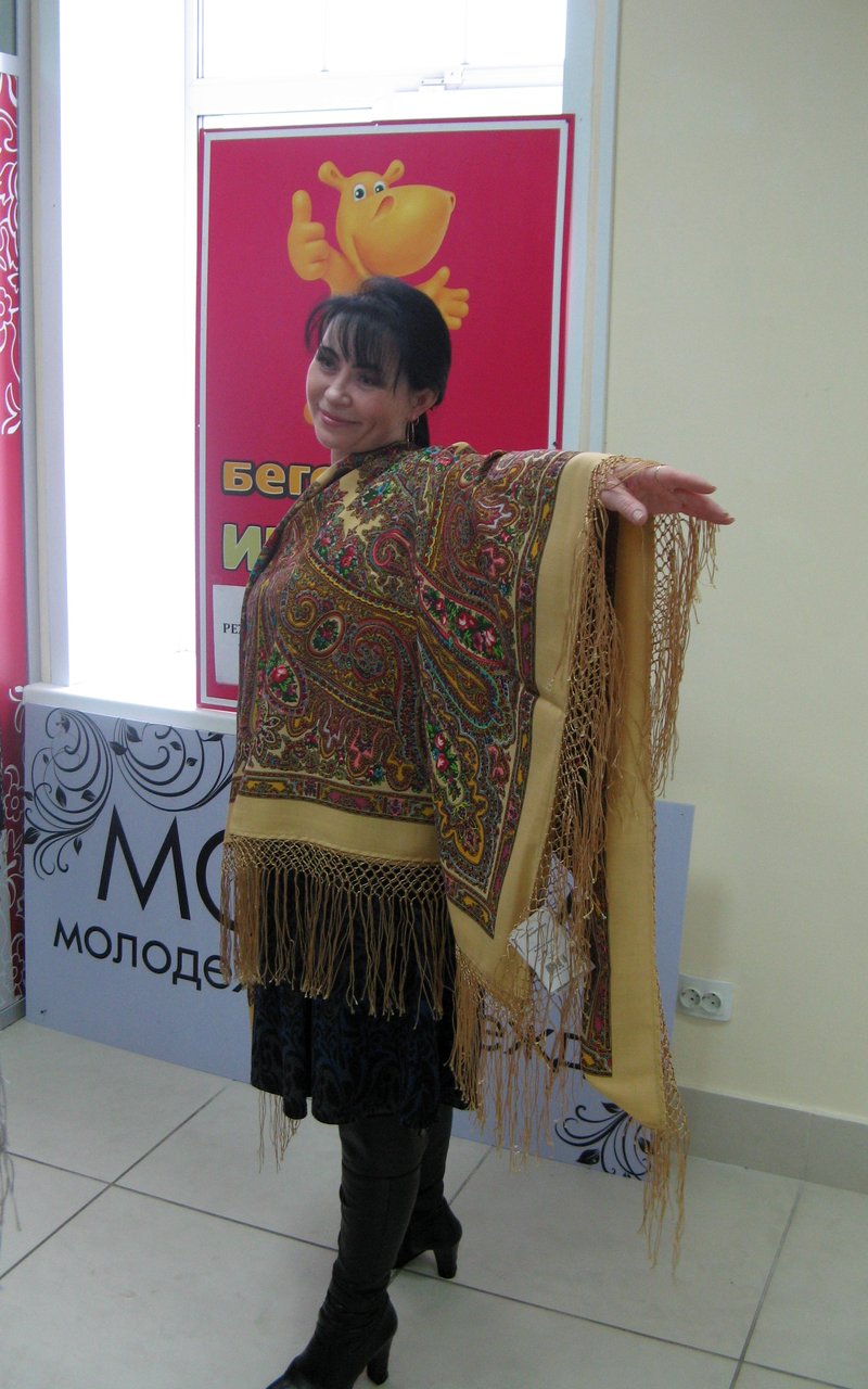 Алена на встречу принесла кроме белопольного ,очень красивого платка и шаль своей мамы.Со слов мамы-шаль японская..Думаю,Алена еще выложит фото платка на "опознание".Ну и у меня на фотоаппарате оказались два кадрика...Печать отличная,цвета яркие..