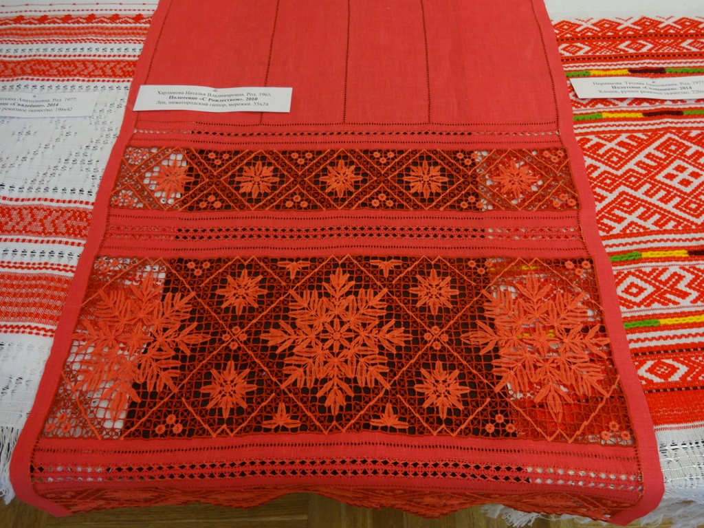 "Все виды декоративно-прикладного искусства, которыми занимаются рукодельницы, представлены на этой выставке. Это – золотное шитье, вышивка полотенец традиционными швами: крест, роспись, набор, тамбур, гладь, владимирский верхошов, цветная перевить, нижегородский гипюр, – вышивка лентами, бисером. Золотное шитье применено в церковной утвари, в народном костюме и панно.Традиционные куклы привлекают внимание зрителя своей непосредственностью и необычностью.