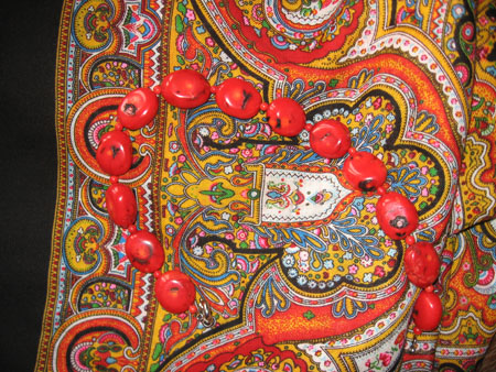 Смотрю я на бусы из яшмы, Ласковый вечер, вижу, что схожи по цвету с моими из турмалина. Бусы помесь крошки с галтовкой, в основном камешки зеленые плюс других цветов немножко. И как правило их именно с "балаганчиком" одеваю, а летом таким же крепдешиновым шарфом, что у вас. Надо сделать фото, может это мне так кажется, но общее ощущение что мысли сходятся.