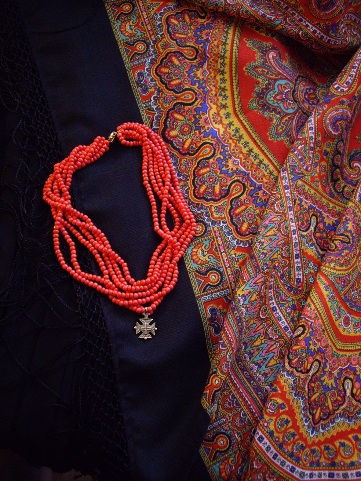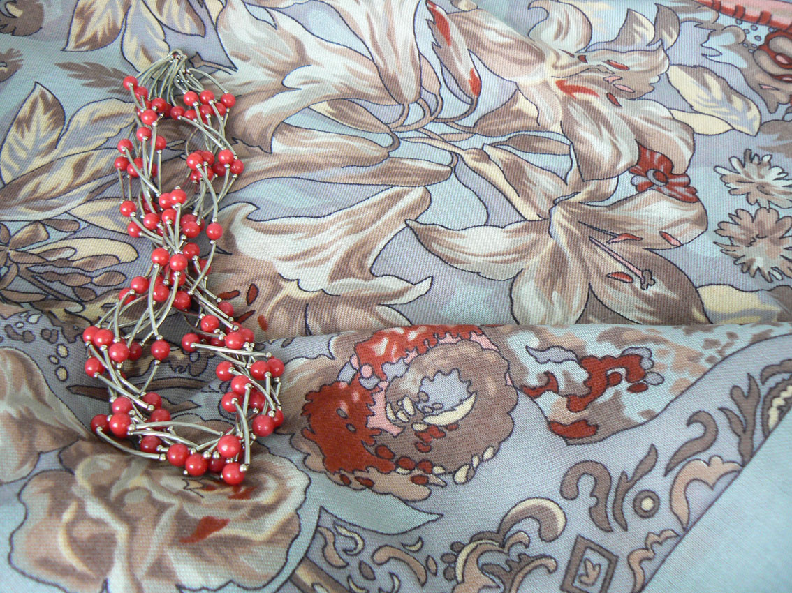 Пока выложу две фотографии с браслетами на разных платочках. И там, и там есть кораллы. Для меня в таком виде они совершенно непривычны, - привыкла, что обычно бусы розового цвета. А тут совсем другое о них представление. К сожалению, это только браслеты. На красное колье банально не хватило денег.