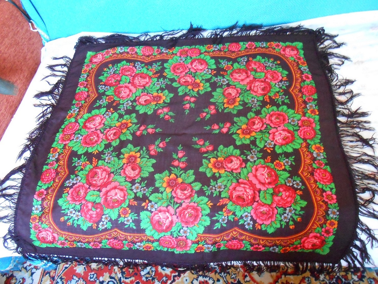 И еще один платок, куплен в секонд-хэнде за копейки. Ниточку из осыпки сожгла, пахнет рогом или животинкой, не помню, но мама сказала так пахнет натур. шерсть. Платок размером 125х125 см, край осыпка, на фото выглядит бледней, чем в жизни.(Кликните, чтобы почитать, что спрятано под катом)... Этот я тоже в базе не увидела.