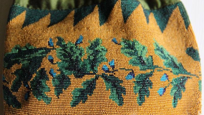 Один из множества экспонатов на выставке "Мода Пушкинской эпохи" - ридикюль с дубовыми листьями. 19 век. Реставрация в 2013-ом году.