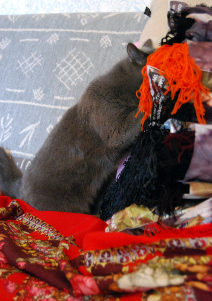 Сегодня занырнула в свои закрома, для поиска красной "Амалии"(хотела сделать фотосессию для темы про красный цвет), платок оказался на самом дне. Пока я занималась фотографированием, мой котик успел тщательно обследовать содержимое закромов