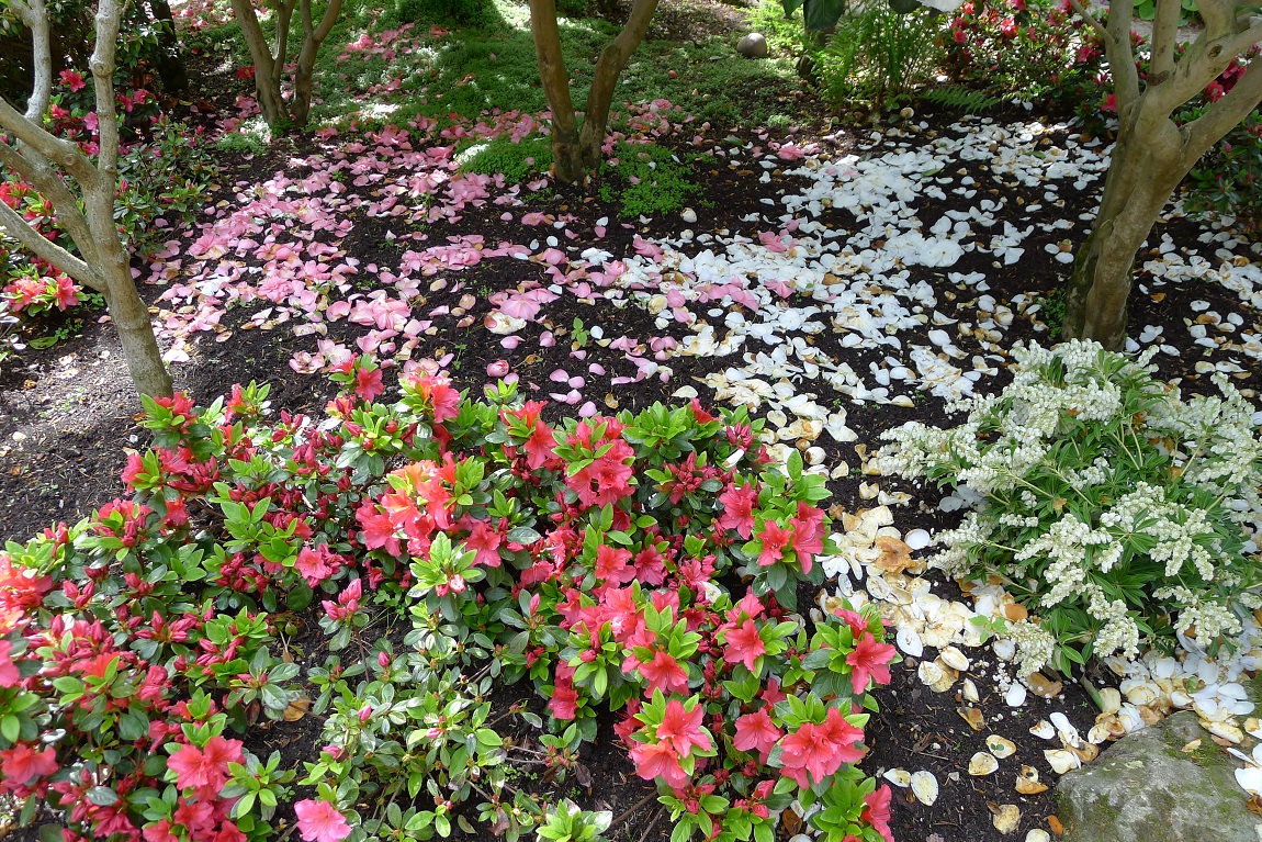 Для создания иллюзии просторного пространства в японском языке используется понятие пустоты. Пустота освобождает взгляд зрителя от визуальных препятствий, придавая пейзажу глубину. Для достижения эффекта пустоты в японском саду используются различные приемы – размещение солитеров около дома (японский клен, магнолия, хамацепарис), особая стрижка растений (подрезанные кусты азалий, падубов, бирючины, самшита, которые имитируют камни). Необходимый элемент сада – камни – зарыты на две трети высоты в землю и должны, согласно японской традиции, устанавливаться так, чтобы подчеркивать свою фактуру, а мох призван сглаживать контраст между камнем и землей.