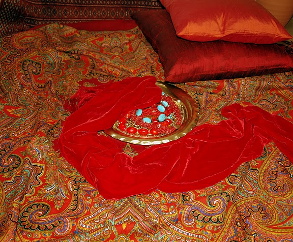 Julia S., какой тщательный подбор. И бусы трёх видов, и подушки двух цветов, и газовый шарфик, и кончик ковра и заднем плане виднеется. Красота.