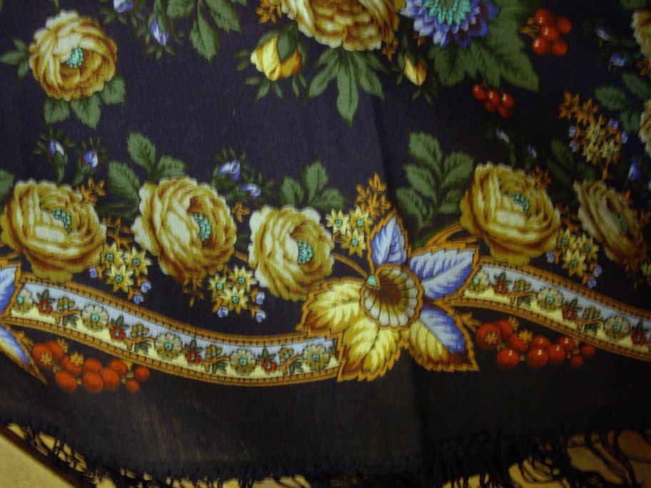 Я покупала этот платок и передарила.От него образовалось двоякое впечатление. На солнечном свету он яркий достаточный, светлые красивые цветы с оттенками бнлоснежными украшают его по углам, очень хорошо смотрится это на голове, но я на голове платки не ношу, а как шаль на плечах он теряет свой рисунок за счет того, что по кайме розы темные, жетоватого-кремового оттенка без единого белого пятнышка. Цвет этот у роз , как грязный, и всё портит. Как шаль на плечах я его забраковала. Когда покупала, понравилось, как он на девушке был. Она меряла его на голову с курточкой из коричневой норки. Выглядело отлично. Так что если планируете носить на голове- он хорошо смотрится -все цветы яркие у лица. Если шалью носить, то эффект теряется. Правильно Софико сказала, он выглядит мрачным и домашним, особенно при вечернем освещении.