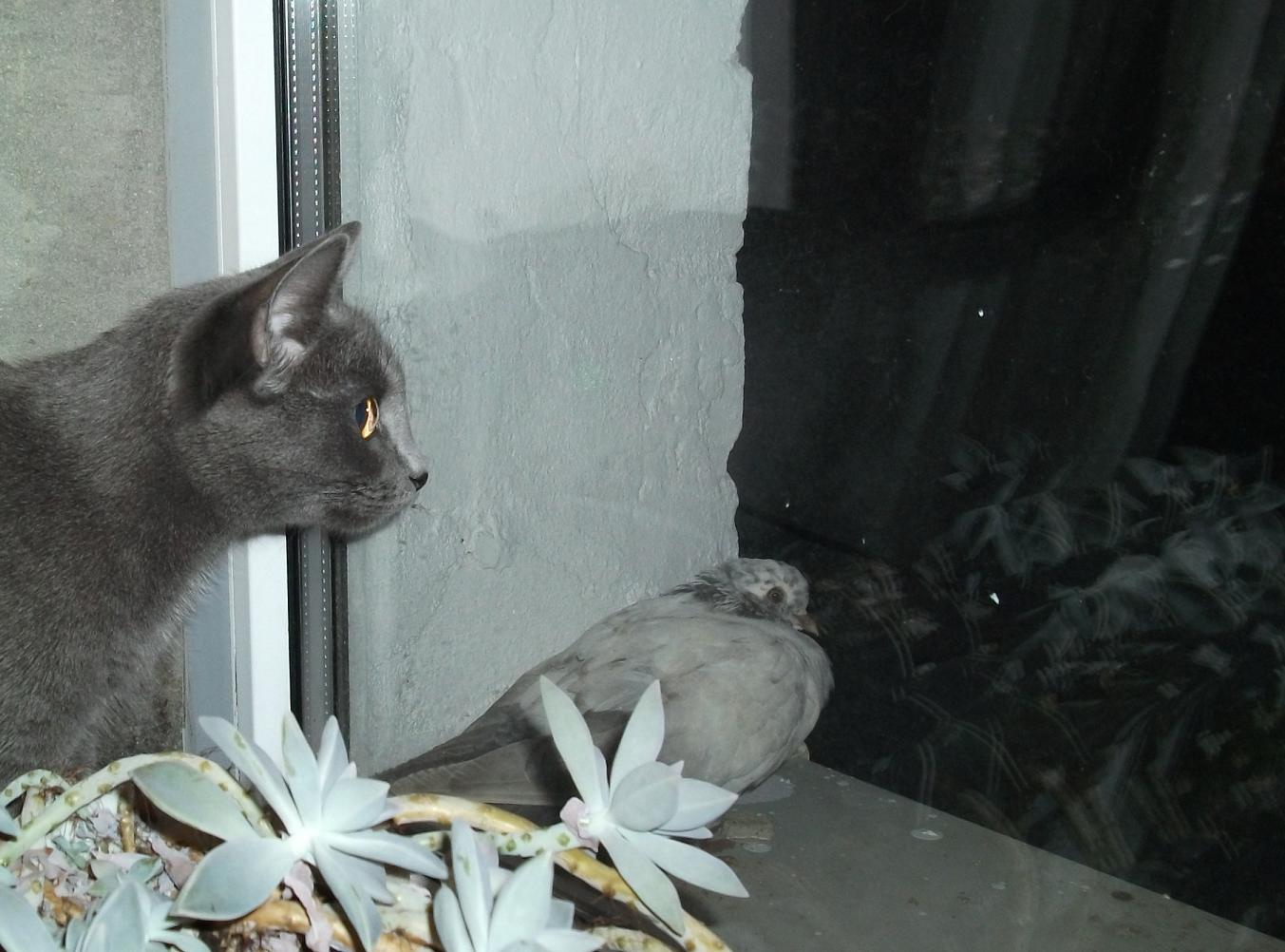 А голубь - ноль внимания! Ему там за стеклом хорошо. Спать собирается. А Киса его до ночи караулила. Потом тоже спать пошла - видимо надоело просто так сидеть..