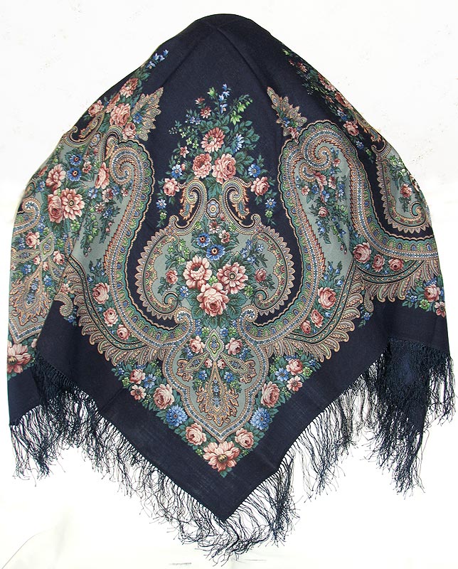 У моего кайма тёмно-синяя, а медальоны блёкло-бирюзовые, розы бледные с бордовыми серединками, и вообщем платок спокойно-уравновешенный.