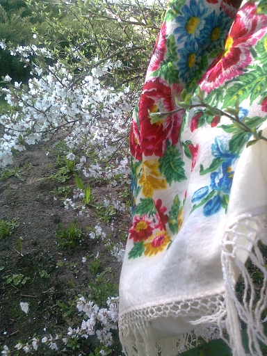 9 мая со мною в весеннем саду у мамы был платок Семена Петровича Рыжова. Белопольный платок с маками, один угол из "Четырех праздников".