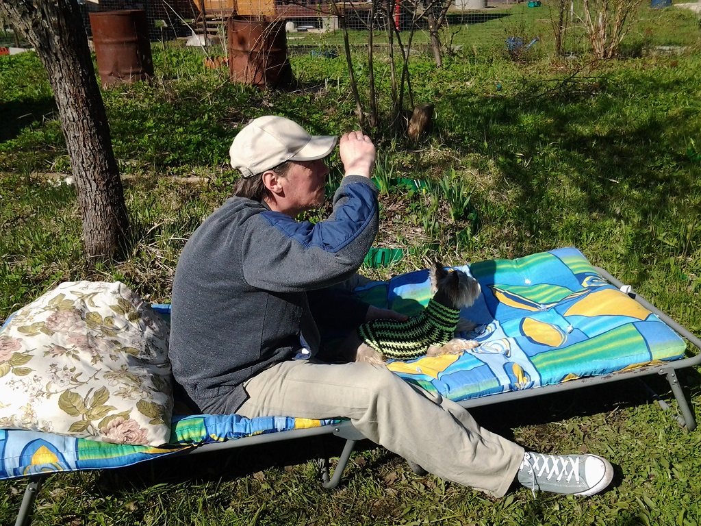 Вывезли мы свою песину первый раз на дачу. За 4 дня собрали на ней 10 клещей, слава богу ни один не успел впиться. К сожалению погода была прохладная, в доме сыро, поэтому все время сидели на улице на раскладушках. Кнопочка подмерзала, одевали ее в вязаный кафтанчик (слава богу я догадалась взять на всякий случай). И спала она ночью со мной под одеялом. У нас с мужем загорели лица и кисти рук. Кнопочка оказалась охранником. Пришлось подручными средствами срочно заделывать все щели в заборах - она с легкостью выныривала сквозь них (мы успевали ловить). Гоняла кошек по участку, мы и не знали что там их столько развелось. Под нашим домом такие "концерты" по утрам были, а когда кошки под домом дрались, то подпрыгивая ударялись об наш пол. Кнопка с ума сходила, надрывалась от лая.