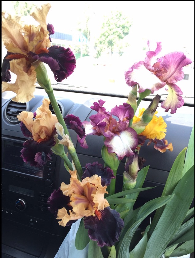 Я сегодня 9 различных сортов Ирисов купила, белый есть, шоколадный, фиолетовый- махровый , но они без цветов, показать не могу, а вот эти с цветами красавчики, везу их домой! Сказали что надо сажать луковицей на юг и повялить их дня три.