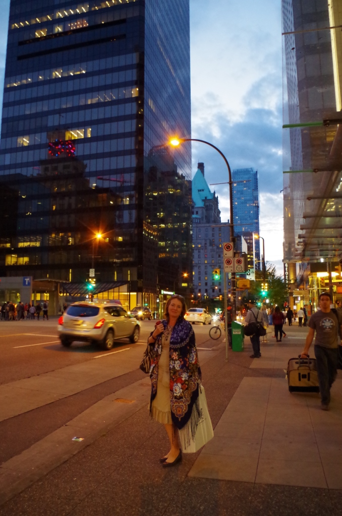 Ближе к вечеру начинало холодать, да и Ванкувер, как любой крупный город, совершенно меняет свой облик в ночное время. Мы решили чуть сменить наш гардероб, надели теплые кофты. Я поменяла шаль – мой выбор Белые Розы 14. Просветик не расставалась с Испанским Вином. Удивительно, как Белые Розы вписалась в ночной Ванкувер! Мы шли с Просветиком, заходили во встречные магазины, смотрели витрины и,опять, говорили о шалях. О городских шалях. О тех шалях, которые легко вписываются в большие города. О том, какую шаль можно взять в то или иное путешествие. О разных выпусках шалей. И опять, и опять возвращались к разговору о Белых Розах 14. Вспомнили, что в одной из тем было обсуждение цвета бусин. Кому-то не нравились лимонные и хотелось белых, как на предыдущих выпусках. На моей шали - лимонные бусины. Я думаю, именно они насыщают шаль лунным светом.