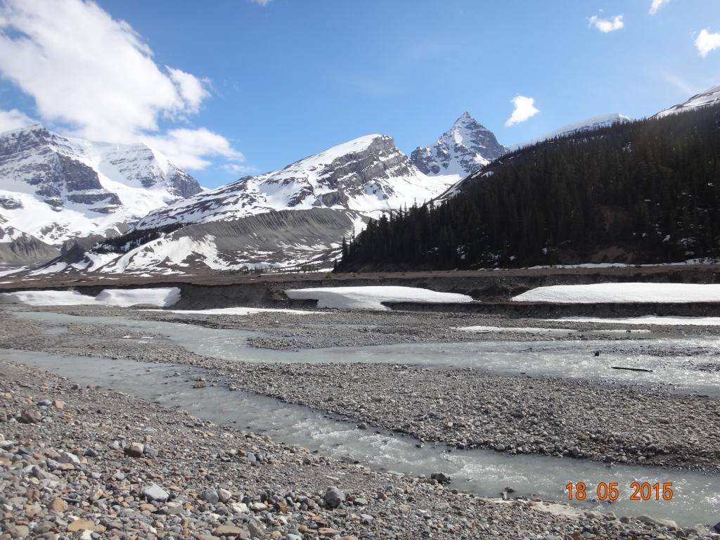 Бóльшая часть дороги проходит по долинам рек Атабаски и Северного Саскачевана,за исключением участков, когда поднимается к перевалам. Летние пейзажи с водопадами,цветущими долинами и лесами сменяются зимними с замёрзшими снежными озёрами и чахлыми ёлочками,утопающими в снегу на горных склонах. Наслаждаясь каждой минутой пребывания в этих местах,не замечаешь,как снижается темп путешествия. Путь,который я расчитывала сделать за три часа,занял все пять.Наступил вечер длинного weekend'а,на дороге собралась пробка.Последние 100 км до Калгари продвигались со скоростью 30 км/ч. У ребят я была уже поздно ночью.