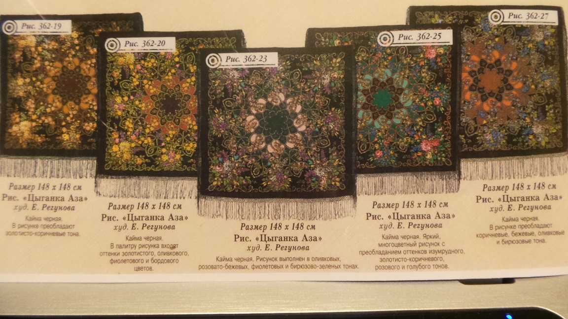 Добавлю фото копии каталога 2005 года ("Элитные шерстяные платки"). Думаю, полезны будут описанием колоритов.