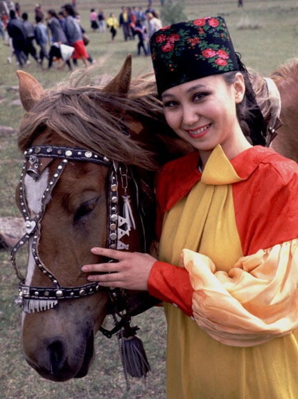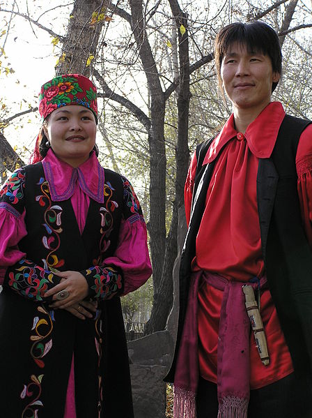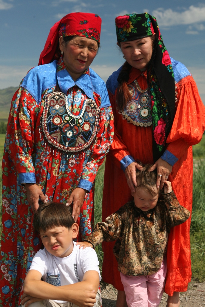 Это хакасские женщины в народном костюме. Как интересно у них держится на голове платок.