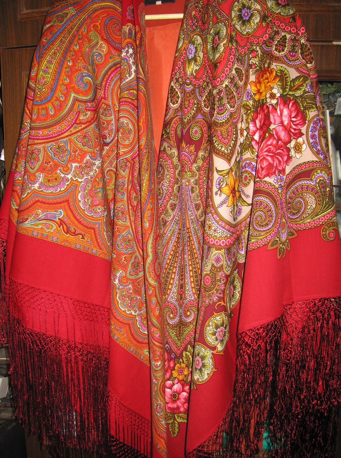 Бледный, нежный, с тонкой прорисовкой платок с бахромой. И яркий, насыщенный, с толстыми линиями - платок с оверлоком. Надо сказать, что именно этот платок привёл меня на platki.ru и ...всё - пропала.