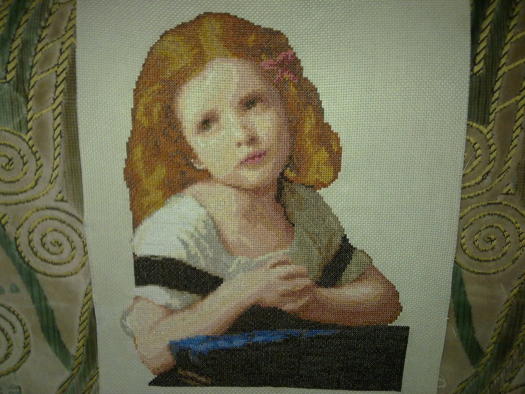 На схемку натолкнулась случайно. Увидела сходство с дочкой,решила что надо! Схема DMC ,нитки подбирала сама "Гамму". Пришла к выводу ,Что по таблице перевода "Гамма"не дает 100 % попадание в цвет. Но все равно довольна. Это моя вторая работа за всю жизнь