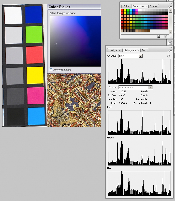 Открываем и ставим опорные точки - и они нам показывают, что от черного ох как далеко. Да и белый не белый, но это не так бросается в глаза. Открываем, расставляем опорные точки в квадратах - видим в цифрах эту проблему. Работаю с областью платка и палитрой (селект на изображении). На гистограмме видно, что цвета не разъехались, только в двух каналах (синий, красный) пики в темном крае. Взяли из обводки цветных квадратов (не знаю откуда они взялись, возможно легло при съемке), ее быть не должно - можно смело игнорировать и сдвигать начало диапазона. Инструментом levels показано, что должно быть сделано (на опорных точках смотрим числа, черный в чистый не ведется - считая, что объект не чисто черный).