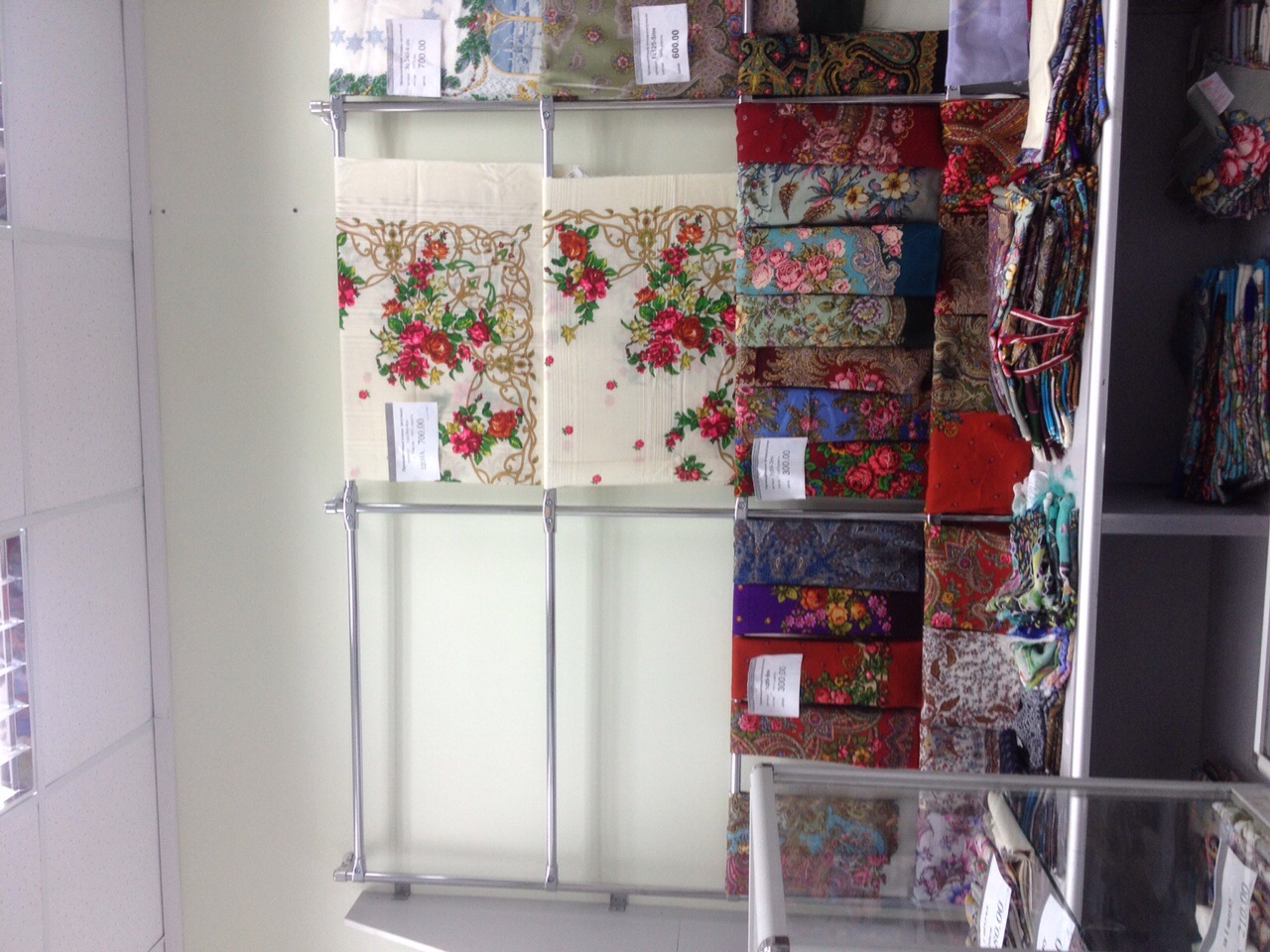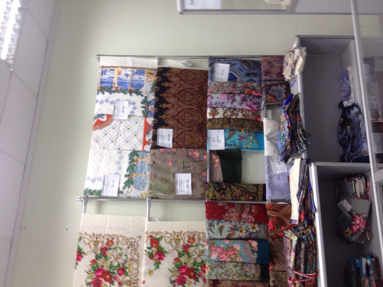 Фото витрин. В мерном лоскуте длина лоскутов небольшая. Шаль Цветущая весна, самый большой лоскут длиной около метра, но обе параллельные кромки срезаны, и есть лоскуты 50-60 см. Платочки такой же длины в лоскуте.