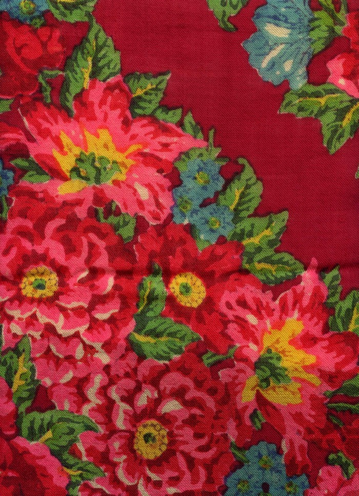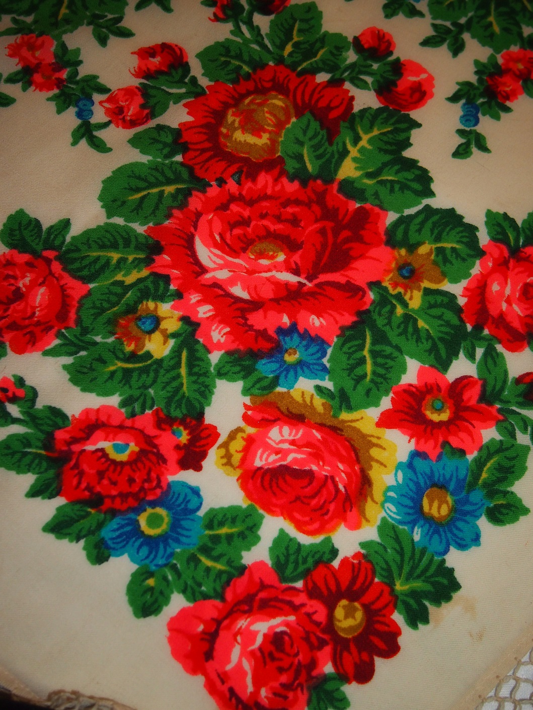 Что касается техники печати Вашей шали, то у меня нет никакого сомнения, что шаль напечатана шаблонами. Думаю, шаль Ваша годов шестидесятых, когда фотофильмпечать внедрялась в производство.